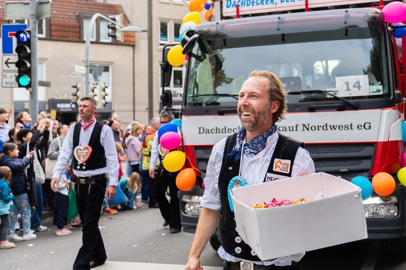 Oldenburg, 27. September 2025 Bei den Dachdeckern werden keine Herzen gebrochen sondern verschenkt. Auch in ihrem Jubiläumsjahr hat die Dachdecker-Innung Oldenburg es sich nicht nehmen lassen, erneut beim traditionellen Kramermarktsumzug mitzufahren. Wie auch in den Vorjahren sorgten sie mit ganz speziellen Naschereien für Begeisterung.